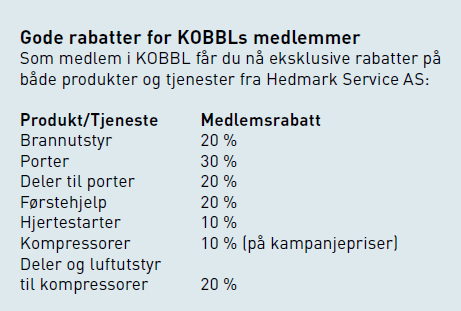Med over 40 års erfaring leverer selskapet produkter som kompressorer, porter, brannutstyr og førstehjelp, og tilbyr nå gunstige rabatter til KOBBLs medlemmer.